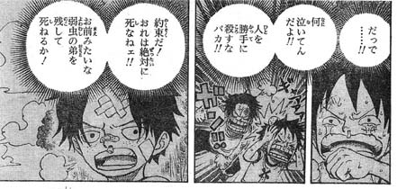 5話 ルフィとエース (ルフィの兄弟1) マリンフォードから随分離れた処で、ルフィとジンベエを乗せたトラファルガー・ローの潜水艦は浮上したが、浮上した地点に海軍の軍艦が1隻待ち構えていた。 乗っていたのは七武海の女帝ハンコックや、インOne piece ネタバレ ワンピース 5話 one piece ワンピース 不確かな物の終着駅one piece ワンピース 5話 簡易版(前半) ここは「不確かな物の終着駅」グレイターミナル 何かに気づくルフィ ルフィ「あ!!」 ゴミ山をこそこそ登るエース one piece ネタバレ ワンピース 5話 one piece ワンピース 親父one piece ワンピース 5話 ルフィを全く無視するエース 街で喧嘩ばかりの毎日 ルフィは牧場の一人息子サボから エースの父親がロジャーだと聞き、凄いと言うルフィを殴るエース 場面変わって夜 ダダン達が酒飲んでルフィの父親が